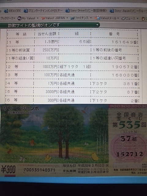 先日、懲りずに占いを信じまたまた買った宝くじ。 占いで言われたラッキーナンバー「6」ですが・・・。 |